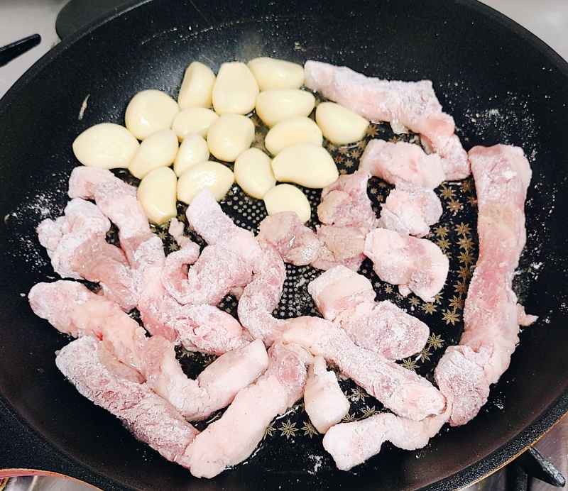 고기를 굽기 전 달군 프라이팬에 식용유를 두르고 약불에서 마늘을 넣고 그 옆에 전분을 묻힌 돼지고기를 넣고 겉면이 노릇해질 때까지 구워주세요