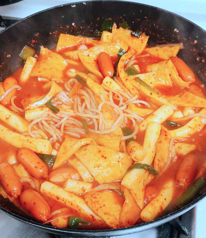 밀떡이 하얗게 불면 양념장을 넣은뒤 뚜껑을 열고 약불에서 졸여줍니다 (이때 개인의 취향에 따라 양념을 가감해 주세요