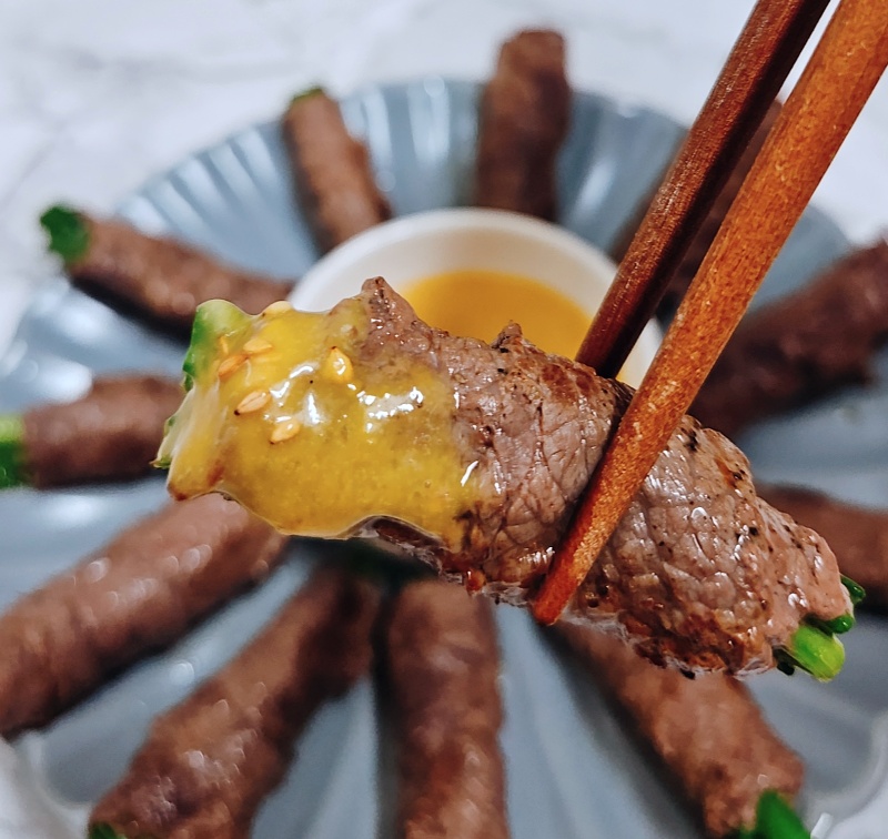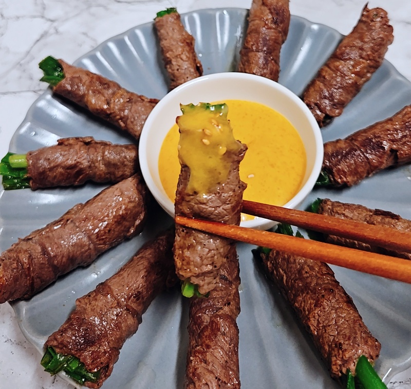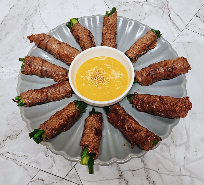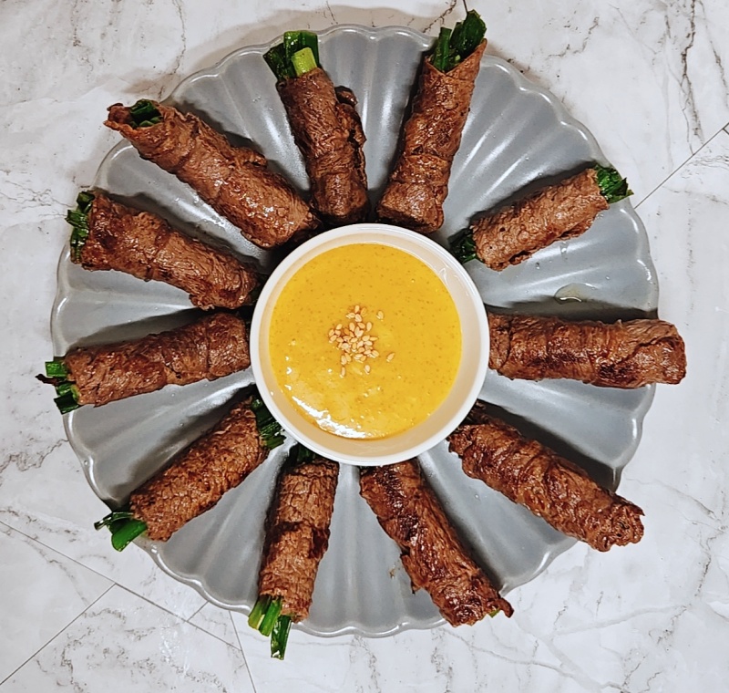 겨자소스에 찍으니 고기와 쪽파가 잘 어울려요