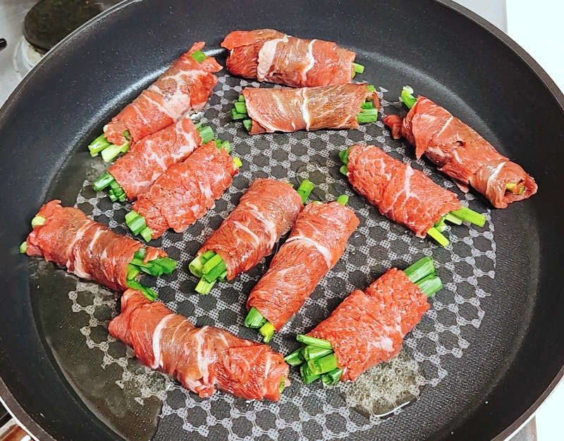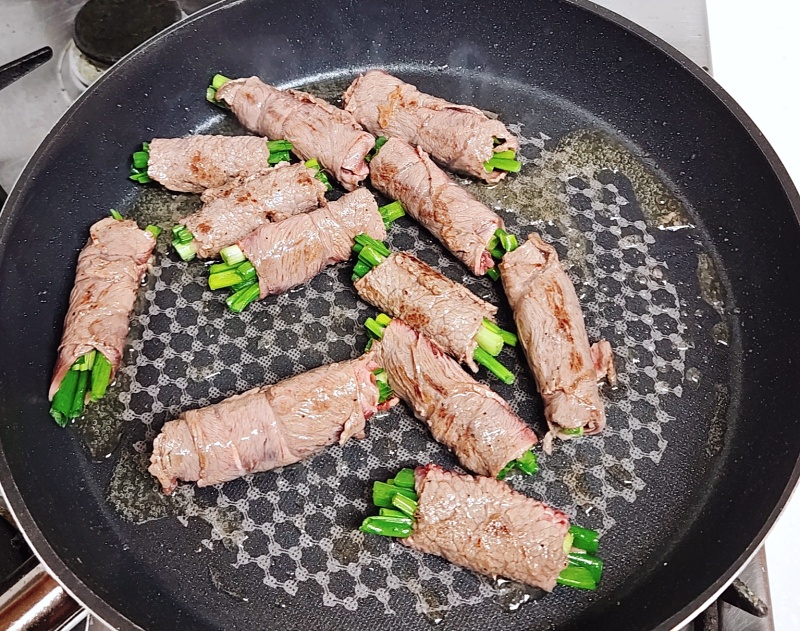 여러 번 말아서 고기안쪽까지 잘 안 익을 것 같다고 생각되면 뚜껑을 닫고 익혀주시면 더 금방 익습니다
