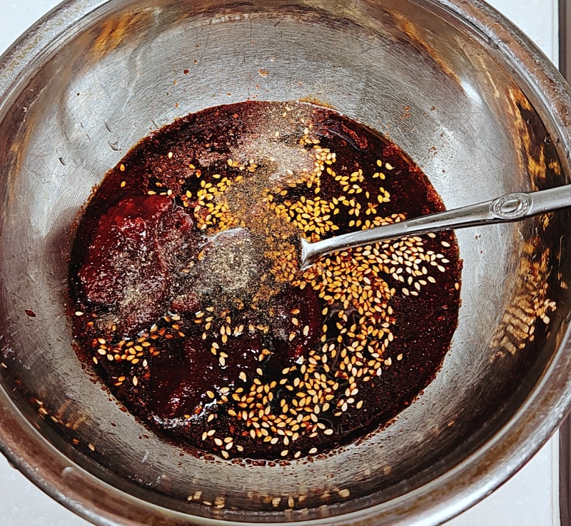 양념 : 고춧가루 2T, 간장 4T, 올리고당 6T, 고추장 4T, 통깨 2t, 참기름 2t, 후춧가루 1/2t