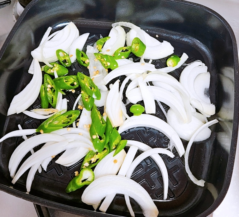 프라이팬이나 궁중팬에 양파 채 썬 거와 청양고추를 넣고