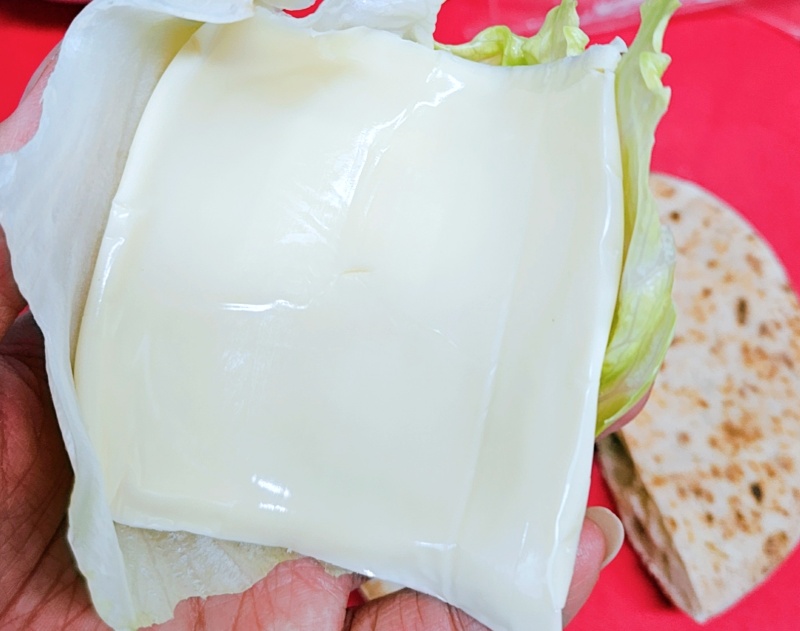 상추나 양상추위에 슬라이스치즈를 올리고 그 상태로 빵 안에 넣어주세요