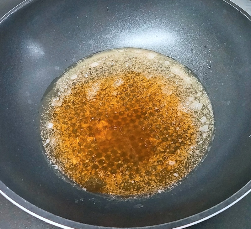 물엿 6스푼을 넣고 섞어준 다음, 청양고추를 넣고 보글보글 끓어오르면 완성입니다