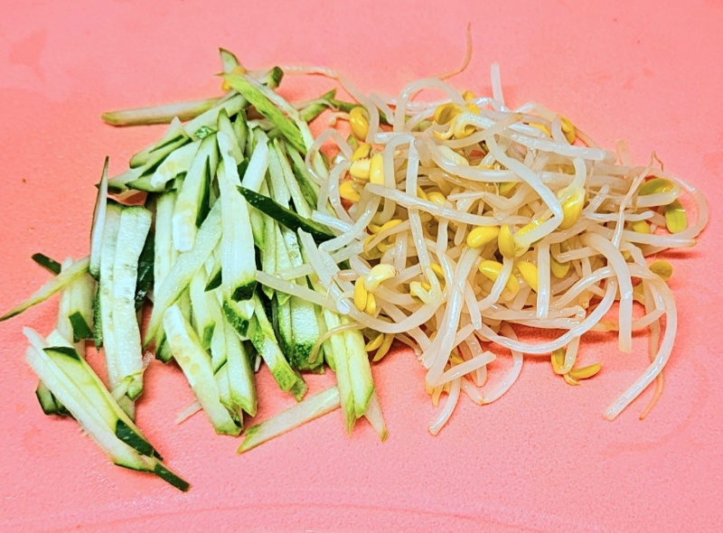 그릇에 쫄면을 담고 그 위에 콩나물, 오이를 올려줍니다