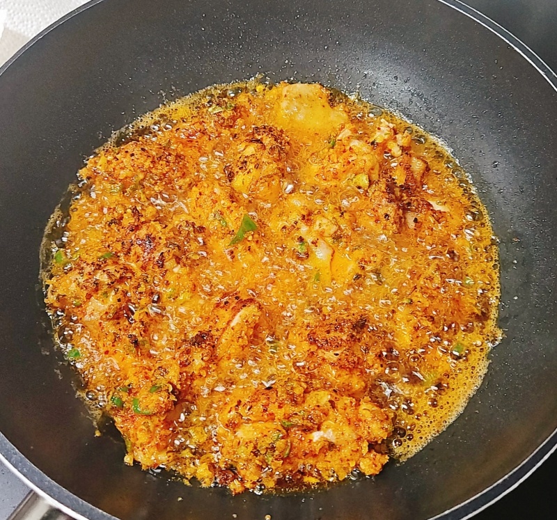 골고루 잘 묻었다면 기름을 닭다리살이 자박하게 잠기도록 넣고 중 약불에서 천천히 튀겨주세요