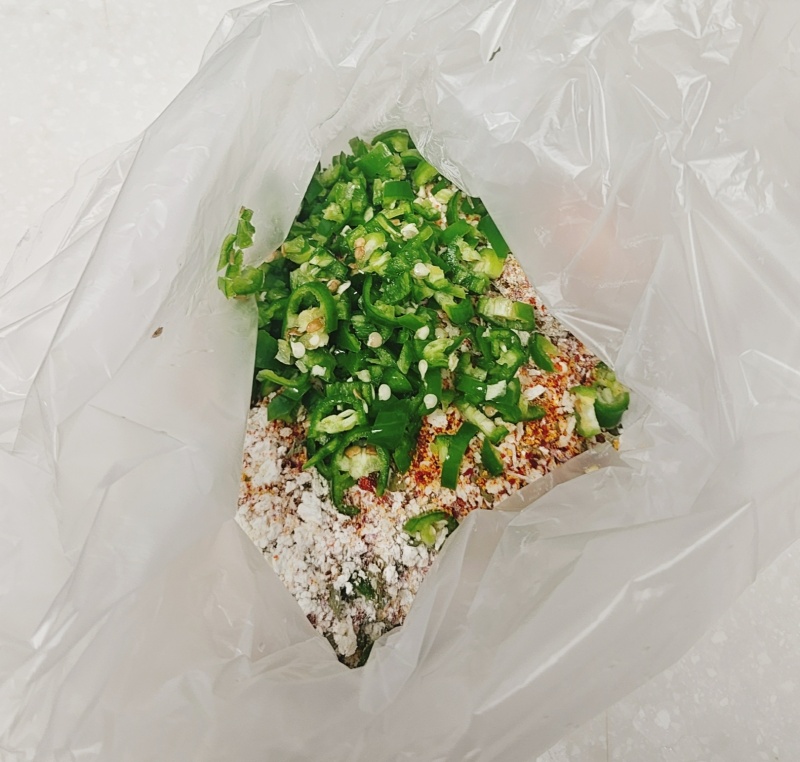 비닐봉지에 튀김가루 3큰술, 빵가루 3큰술, 고춧가루 1.5큰술, 카레가루 1큰술, 청양고추 2개 다진 것, 다진 마늘 1큰술, 파슬리 1큰술, 맛소금 한 꼬집을 넣고 잘 섞어주세요