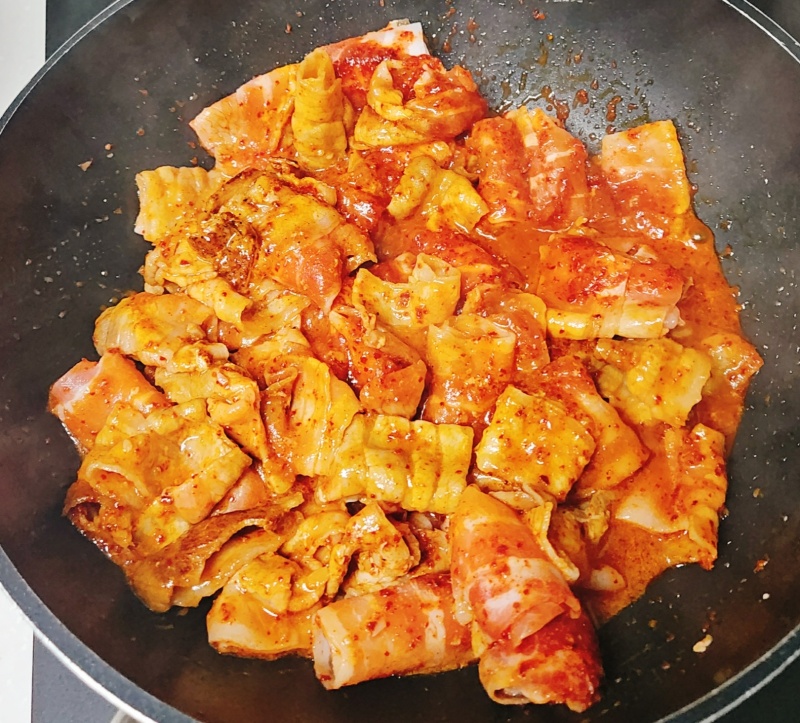 3. 그대로 팬에 넣고 대패삼겹살을 볶아줍니다