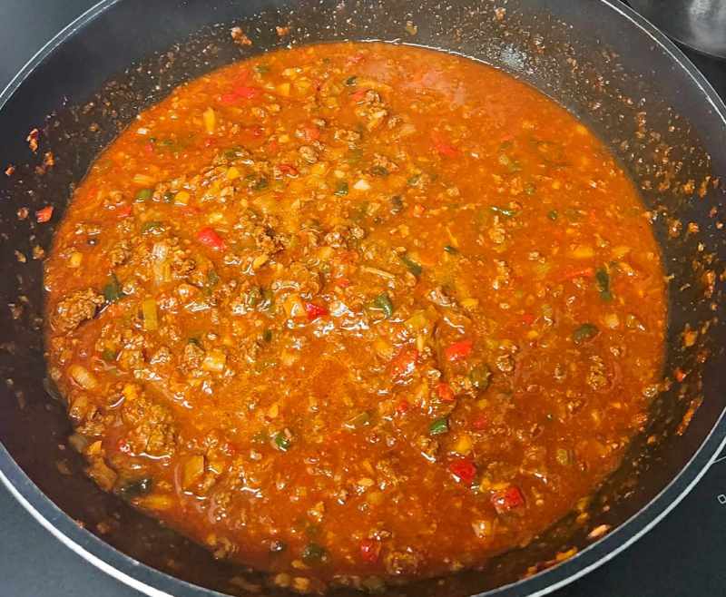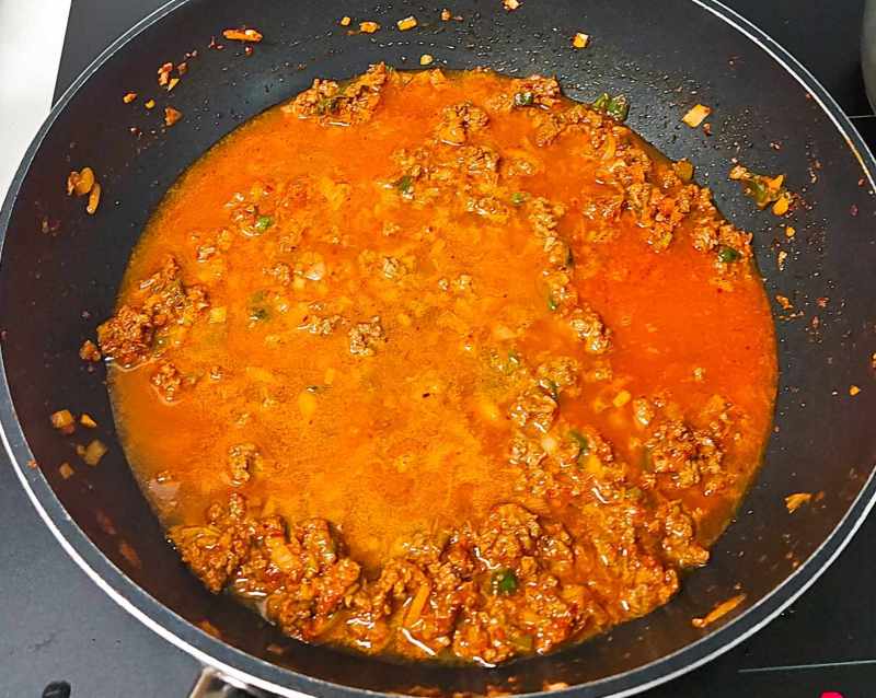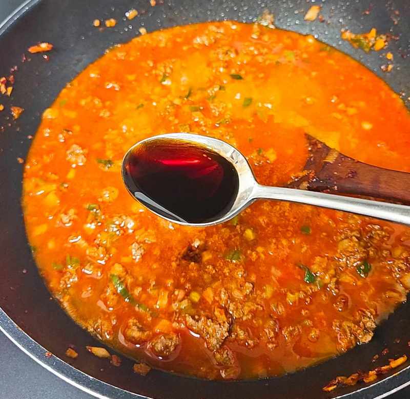 5. 소고기다짐육이 익으면 물 2컵을 넣어주고 간장 4스푼, 맛술 4스푼, 물엿 4스푼, 고추장 1/2스푼, 된장 1스푼, 치킨스톡 1스푼, 굴소스 2스푼, 다진 마늘 1스푼, 후추 1/2스푼을 넣고 보글보글 끓여줍니다