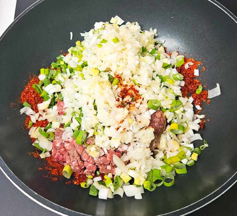 궁중팬에 식용유 4스푼을 넣고 다진 생강과 고춧가루 5스푼을 넣고 약불에서 고추기름을 내주다가 소고기다짐육과 다진 양파, 대파를 넣고 볶아주세요