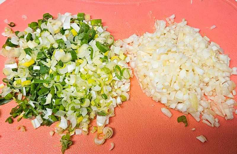 2. 양파는 곱게 다지고 청양고추와 홍고추는 반갈라 씨를 빼고 잘게 다져줍니다