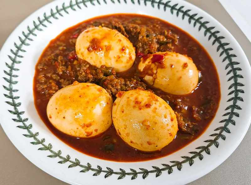 계란 10개~15개, 소고기다짐육 300g, 대파 2대, 양파 1/2개, 다진 생강 1/2스푼, 고춧가루 5스푼, 식용유 4스푼, 청양고추 2개, 홍고추 2개, 간장 4스푼, 맛술 4스푼, 물엿 4스푼, 고추장 1/2스푼, 된장 1스푼, 치킨스톡 1스푼, 굴소스 2스푼, 다진 마늘 1스푼, 후추 1/2스푼, 참기름 약간, 참깨 약간