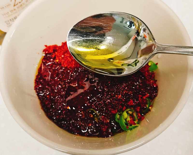 1. 청양고추는 원하시는 만큼 쫑쫑 썰어서 작은그릇에 넣고 고춧가루 3스푼, 올리브유 6스푼과 건더기스프를 넣고 잘 섞어주세요