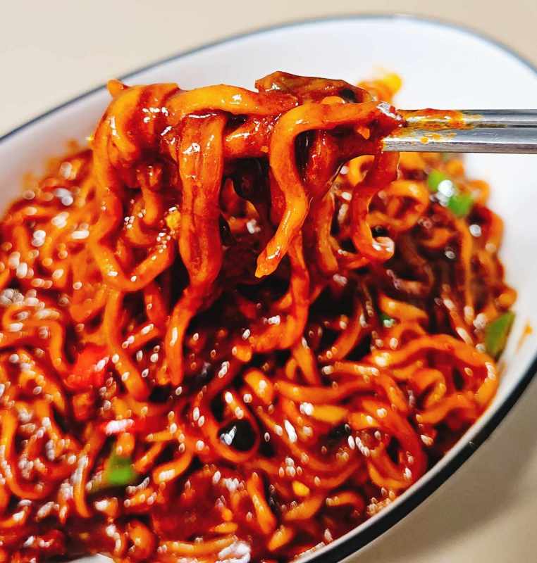 면이 거의 익었을때 즈음 고추기름 소스를 넣고 다시 한번 볶아주면 완성입니다